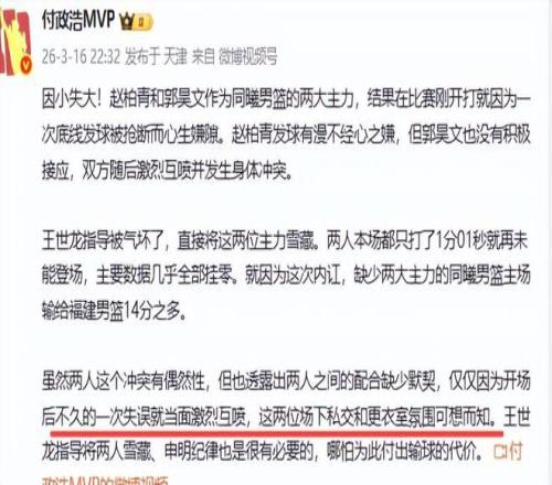 球迷說,比賽剛剛開始,就是丟了兩分也不是什么大事,后面可以打回來,何必爆發(fā)內(nèi)訌?那么為何趙柏青和郭昊文如此不相待,險些大打出手呢?這不僅僅是表面上的發(fā)球失誤,媒體人付政浩發(fā)文說出深層次原因,那就是隊內(nèi)競爭激烈,或早已積怨不淺。付政浩表示,“這場失利不僅暴露了兩位主力球員之間的不和睦,而且難免會讓冠名商頗為敗興。更重要的是,這一個細節(jié)也暴露出同曦更衣室的微妙氛圍。”