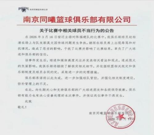 2名球員比賽過(guò)程中起爭(zhēng)執(zhí)南京同曦籃球俱樂(lè)部致歉
