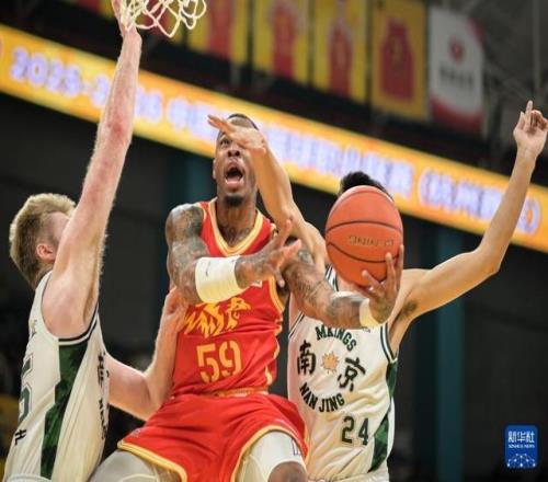 3月11日,南京天之藍隊球員漢茲(中)在比賽中突破。新華社記者 江漢 攝