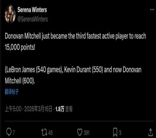 本場米切爾表現(xiàn)不錯(cuò),24中10拿下26分1板11助2搶斷,個(gè)人生涯總分突破15000分大關(guān)。