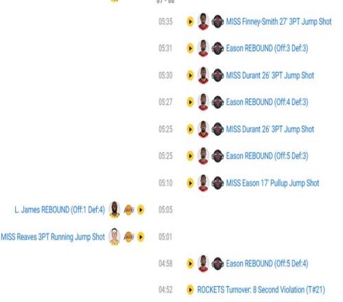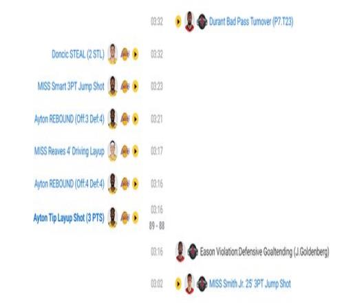 終場前4分52秒杜蘭特8秒不過半場低級失誤,也是這個失誤讓艾頓籃下補籃幫助湖人反超,終場前3分32秒杜蘭特又是一個想要穿過兩人包夾的傳球失誤,不得不說KD這一波令人很無奈,短短118秒里2鐵+2失誤。