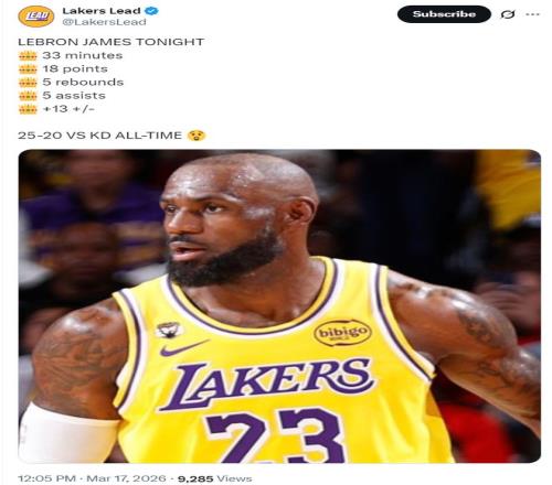 他全場比賽33分鐘,13中7,三分3中1,罰球4中3,拿到18分5籃板5助攻2搶斷1失誤,命中率53.8%,真實命中率61%,正負(fù)值+13的全面數(shù)據(jù)。詹姆斯自3月13日復(fù)出以來湖人沒有輸過球。