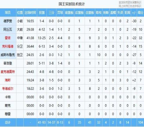 國王:雷諾32分9板3助、克利福德15分8板6助、普洛登14分1板1助2斷、麥克德莫特12分3板2助、阿丘瓦10分7板2助...