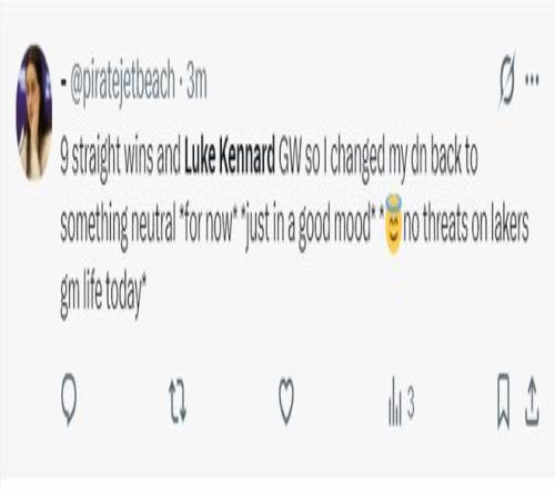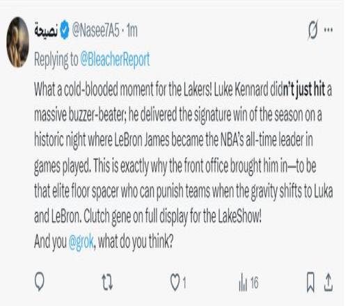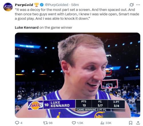 賽后湖人球迷寫道:肯納德這是一個多么冷酷無情的時刻啊,他不僅完成了絕殺,他還幫助詹姆斯完成了歷史性的時刻,詹姆斯超越帕里什成為歷史出場王。這就是湖人引進(jìn)他的原因,他總是在關(guān)鍵時刻挺身而出,在詹姆斯、東契奇、里夫斯被限制的情況下他在決勝時刻命中絕殺。