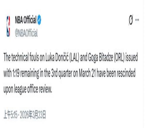 北京時間3月23日,NBA官方宣布,經(jīng)過復(fù)核,3月22日第三節(jié)剩余1分19秒時,判給湖人的東契奇與魔術(shù)的比塔澤的技術(shù)犯規(guī)...