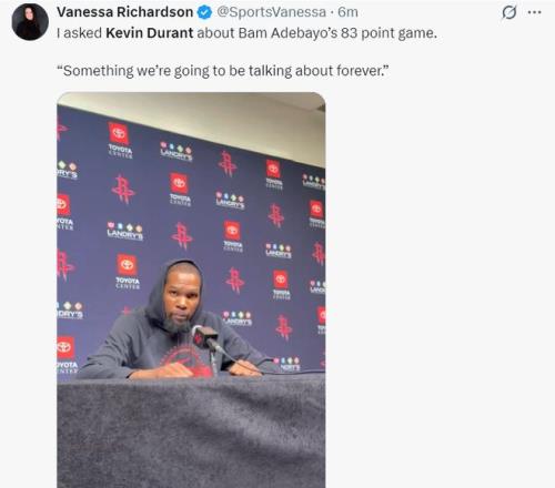 賽后杜蘭特談到阿德巴約單場(chǎng)83分,他說道:我們將永久討論他這場(chǎng)的豐功偉績(jī)。