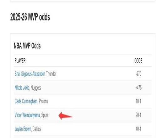 目前文班亞馬的MVP賠率僅僅排在第四位,可本賽季文班亞馬不管是面對(duì)SGA、約基奇、坎寧安都是碾壓的存在。