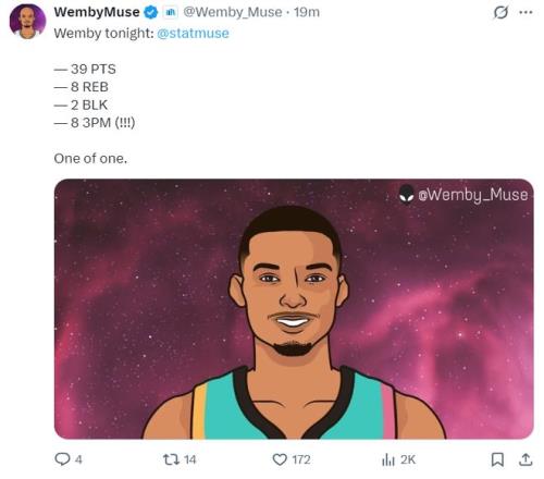此役文班亞馬是完勝塔圖姆,他全場(chǎng)比賽36分鐘,20中11,三分15中8,罰球12中9,拿到39分11籃板3助攻1搶斷2蓋帽6失誤,命中率55%,三分命中率53.3%,真實(shí)命中率77.1%,正負(fù)值+5。