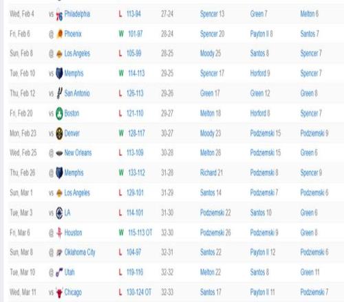 自1月31日對陣活塞后庫里就高掛免戰(zhàn)牌,這期間勇士的15場比賽輸?shù)袅似渲?0場,勇士也從西部第八掉到西部第九,勇士與快船的勝場已經(jīng)拉開到1個,勇士已經(jīng)處于附加賽下半?yún)^(qū)。