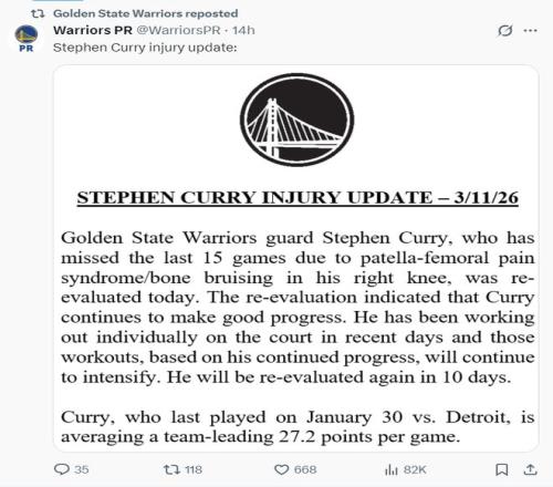 根據(jù)勇士官方的說法,庫里因為右膝髕股疼痛綜合征/骨挫傷已連續(xù)缺席15場比賽,球隊對他進行了新的評估。評估結(jié)果顯示庫里的恢復取得了進展但還沒有達到回歸賽場的要求,他將在10天后再度評估。
