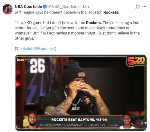 前NBA球員蒂格:我喜歡看杜蘭特的比賽,但我并不看好火箭。他們?nèi)鄙倭艘粋€(gè)能獨(dú)當(dāng)一面的第二巨頭,像申京這樣的球員只能偶爾貢獻(xiàn)。一旦杜蘭特?zé)o法打出超水平的表現(xiàn)這支球隊(duì)就沒(méi)有真的值得信任的球員了。