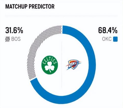 賽前,美媒ESPN對(duì)本場(chǎng)比賽進(jìn)行了勝率預(yù)測(cè),凱爾特人勝率僅有31.6% ,雷霆?jiǎng)俾蕜t高達(dá)68.4% ,差距非常明顯。