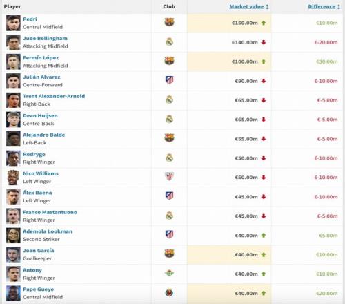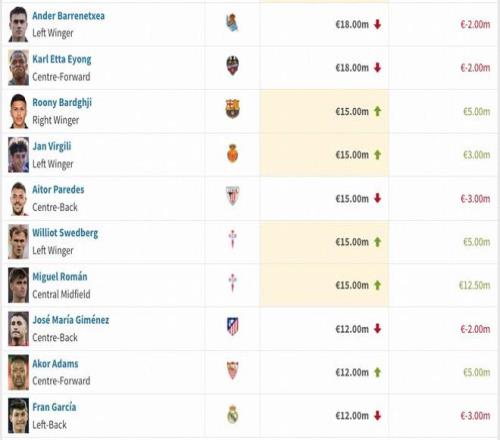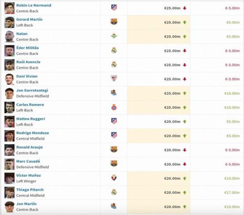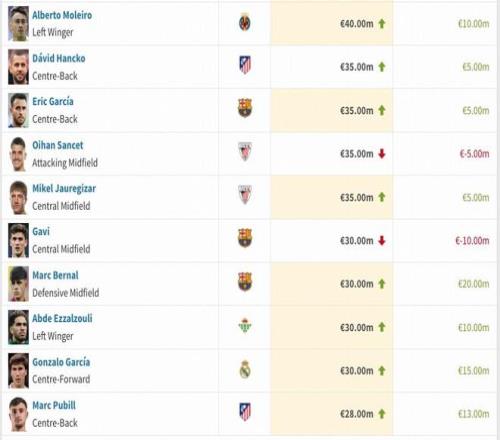 西甲球員本期身價(jià)變動(dòng)詳情