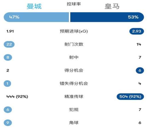 雙方門將均表現神勇,曼城全場22次射門,預期進球數1.91,皇馬14次射門,預期進球數2.93,兩隊一共創(chuàng)造了8次絕佳機會。