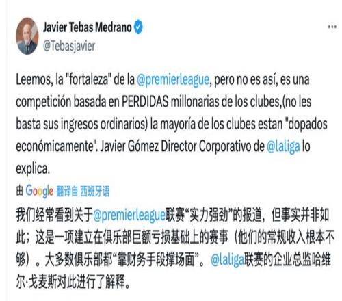 對(duì)于英超聯(lián)賽在轉(zhuǎn)會(huì)市場(chǎng)上的高舉高打,哈維爾-特巴斯一直略有微詞?!叭藗兯?wù)撍^的「英超聯(lián)賽實(shí)力強(qiáng)勁」其實(shí)并非如此。這是一項(xiàng)建立在各俱樂部巨額虧損之上的賽事(他們的常規(guī)收入不足以支撐日常運(yùn)營(yíng)),大多數(shù)俱樂部都在靠財(cái)務(wù)手段撐面子?!?023年年初,哈維爾-特巴斯在個(gè)人推特賬號(hào)上就對(duì)英超的商業(yè)模式進(jìn)行過批評(píng)。