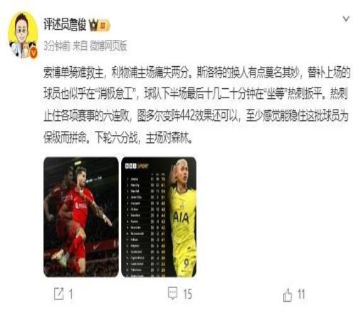 賽后,名嘴詹俊就公開(kāi)質(zhì)疑斯洛特的換人:有點(diǎn)莫名其妙,替補(bǔ)上場(chǎng)的球員也似乎在“消極怠工”,球隊(duì)下半場(chǎng)最后十幾二十分鐘在“坐等”熱刺扳平。