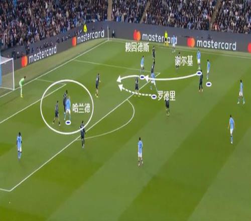 利用哈蘭德牽制對(duì)方的后衛(wèi),曼城找到了肋部的進(jìn)攻空間。謝爾基作為傳球起點(diǎn),賴因德斯前插肋部做球,帶來羅德里的前插。