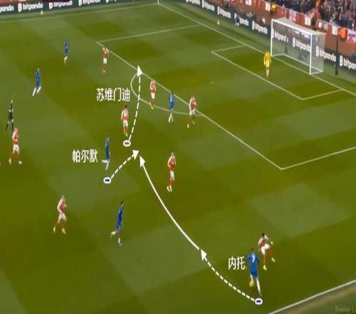 這次也是一樣的道理,切爾西的進(jìn)攻從邊路發(fā)起,佩德羅回撤接應(yīng),結(jié)果蘇維門迪快速向后退,使得阿森納在禁區(qū)正面暴露出很大的空間。