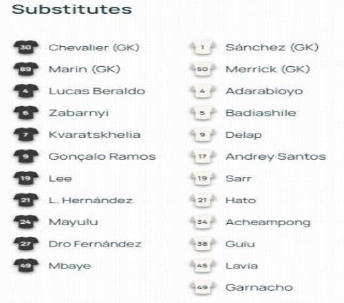 替補(bǔ):4-貝拉爾多、6-扎巴爾尼、7-克瓦拉茨赫利亞、9-拉莫斯、19-李剛?cè)省?1-盧卡斯、24-馬尤盧、27-德羅-費爾南德斯、30-舍瓦利耶、49-姆巴耶、89-馬林