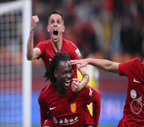重慶銅梁龍隊進球后,球員慶祝。
